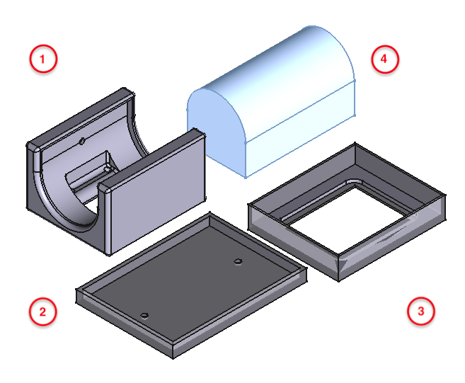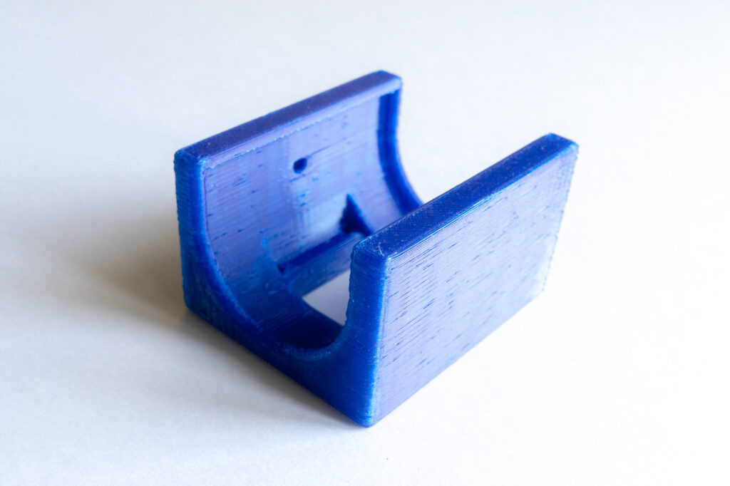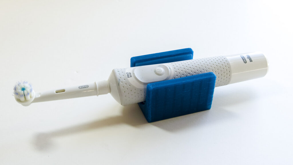 Un support a été réalisé en associant une partie rigide imprimée avec une imprimante 3D et des parties en silicone sous le support pour lui donner de l’adhérence et à l’intérieur pour maintenir la brosse à dents.